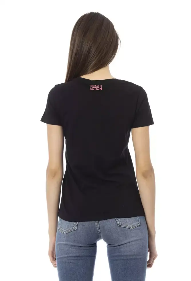 Unleash the epitome of urban chic with Trussardi Action’s Short Sleeve T-shirt. A sleek, black canvas sets the stage for an audacious front print that makes no apologies for its boldness. Designed with the modern trendsetter in mind, this top is an instant upgrade to your wardrobe, pairing seamlessly with everything from edgy denim to tailored blazers. Crafted from a sumptuous blend of cotton and viscose, this piece promises unrivalled comfort and a flattering drape that enhances your silhouette.