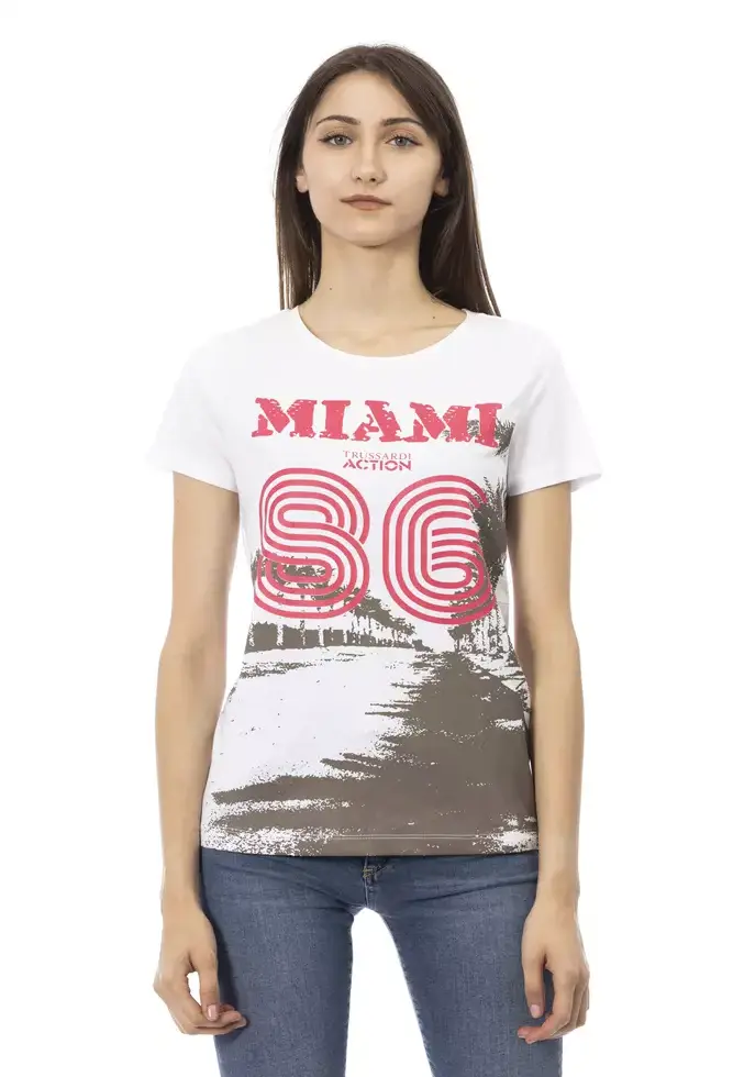 Unleash the essence of casual sophistication with Trussardi Action’s captivating white T-shirt. A perfect blend of comfort and chic, this top features an eye-catching front print that commands attention. Crafted with the finest materials, it offers a round neck and short sleeves for a timeless appeal. Whether you’re out on the town or enjoying a relaxed weekend, this T-shirt is sure to elevate your style quotient.